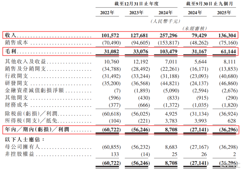2022年、2023年、2024年及2025年1-9月(报告期),公司的收入分别为1.02亿元、1.27亿元、2.57亿元、1.36亿元。
