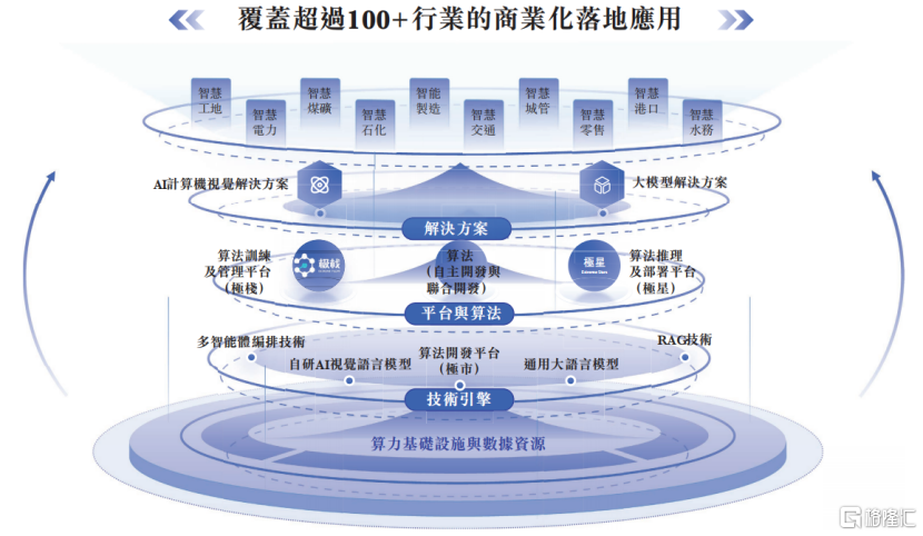 极视角解决方案的交付平台包括极星及极栈,极星是AI算法推理及部署平台,极栈是AI算法训练及管理平台。公司的AI视觉语言模型构成了开发AI解决方案的核心基础设施。