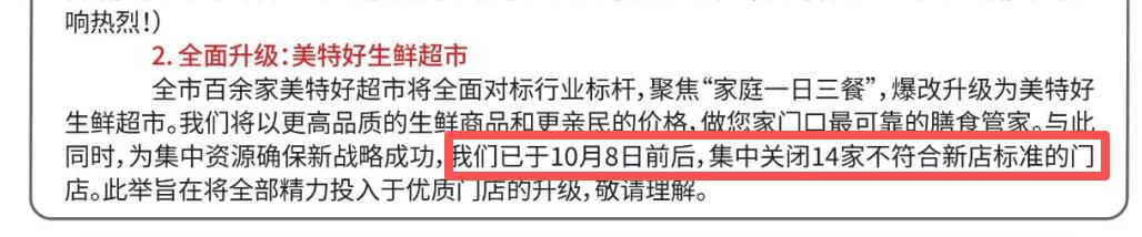 针对市场传言与消费者恐慌,美特好曾发布公告解释,称为集中资源推进新战略,公司于10月8日前后关闭了14家门店,未来将聚焦“美特好生鲜超市”与“开心大集会员店”双品牌运营。