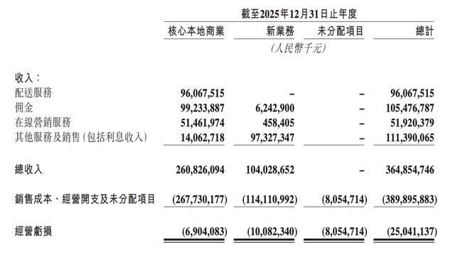 其中,配送服务营收出现下滑,全年为960.67亿元,较2024年同期减少19.98亿元;佣金收入为992.34亿元,同比增长7.53%;在线营销服务收入为140.63亿元,同比增加27.17%。