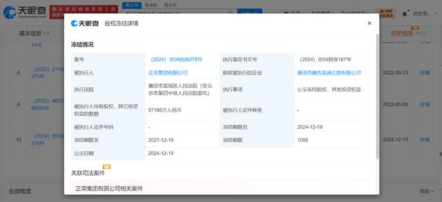 天眼查天眼风险信息显示,近日,正荣集团有限公司新增2条股权冻结信息,股权被执行的企业分别为莆田市莆秀高速公路有限公司、正荣新产业发展有限公司,冻结股权数额分别约为5.7亿元、2亿元,冻结期限均为3年,执行法院分别为福建省莆田市荔城区人民法院、上海市第一中级人民法院。