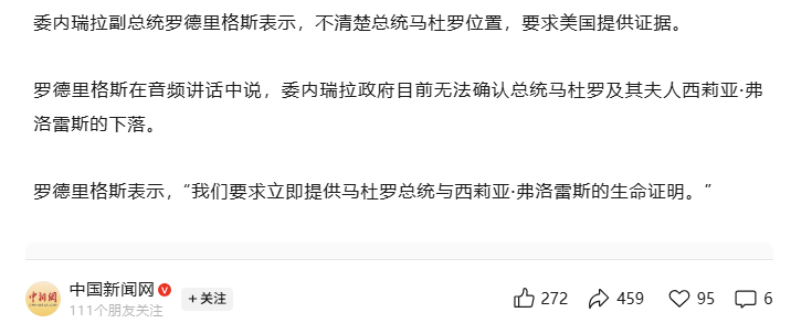 副总统第一时间表示不清楚总统马杜罗位置,要求美国提供证据。“我们要求立即提供马杜罗总统与西莉亚·弗洛雷斯(马杜罗夫人)的生命证明。”