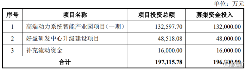 本次IPO,公司拟募集资金19.6亿元,用于高端动力系统智能产业园项目(一期)、好盈研发中心升级建设项目,以及1.6亿元用于补充流动资金。