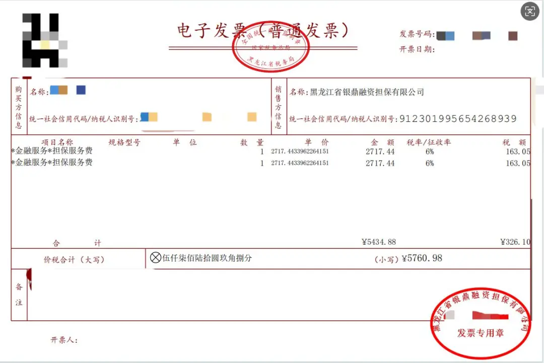 2025年8月18日、8月25日,银鼎融担、嘉合兴融担,分别以“*金融服务*担保服务费”与“*现代服务*担保服务费”名义,向他分别收取了5760.98元(含税326.1元)与4604.04元(含税260.61元)。