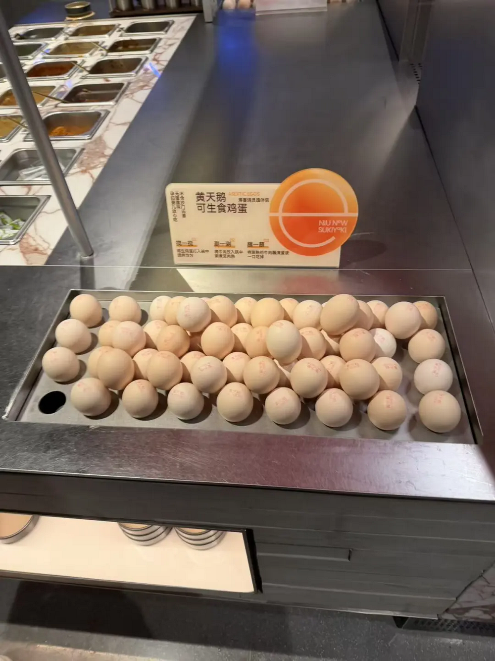 从模式来看,牛New寿喜烧采用的是自助式供应餐品,核心品类包括M级和牛、进口扇贝等生鲜食材,就连搭配的鸡蛋用的也是黄天鹅可生食鸡蛋。