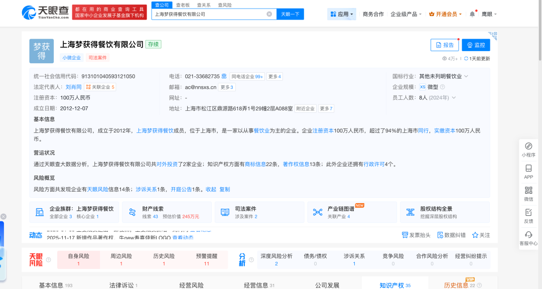 据官方账号显示,其背后关联方为上海梦获得餐饮有限公司,天眼查显示,该公司成立于2012年12月,注册资本100万元,法定代表人为刘肖同,实控人为邱俊森,持股95%。