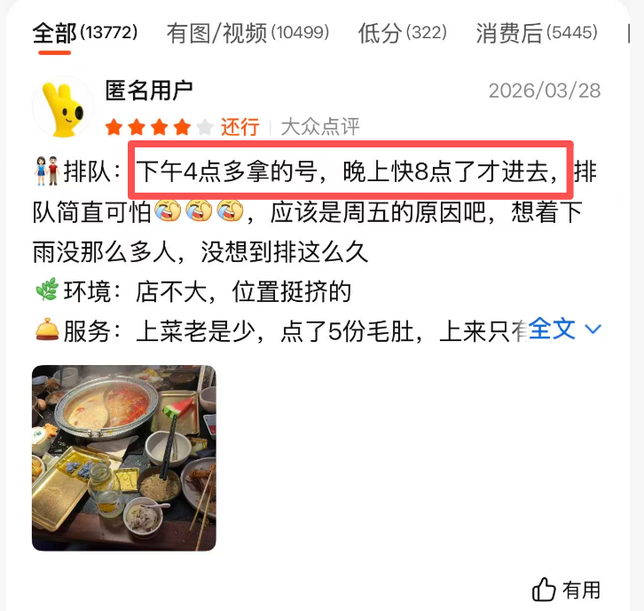 在美团等平台上,不少消费者反馈从下午4点等到晚上8点,排队足足4个小时才进入餐厅。