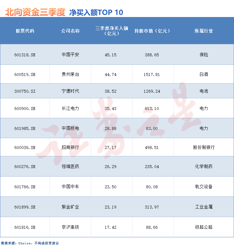 在这些股票中,贵州茅台以其1517.81亿元的持仓市值位居榜首,持股比例达到了6.91%。在三季度,北向资金对贵州茅台的净买入额约为45亿元,而该股票在同一时期内涨幅超19%。