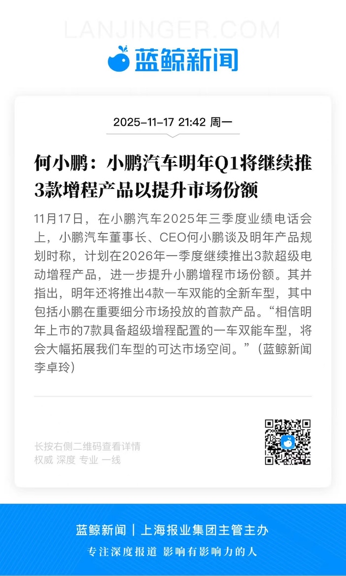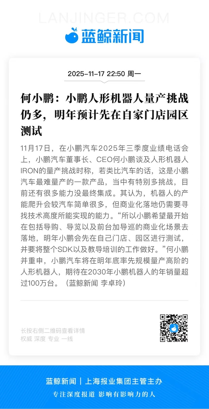 小鹏汽车Q3财报电话会在17日21时压轴举行。电话会上,投资者普遍关注小鹏汽车人形机器人、Robotaxi、增程车型等后续规划和进展,以及小鹏与大众的合作落地。在谈及与大众的合作时,小鹏汽车董事长、CEO何小鹏透露,大众将成为小鹏第二代VLA模型的首发客户,同时,其图灵AI芯片也获大众定点,双方合作研发的车型将会在明年初量产。