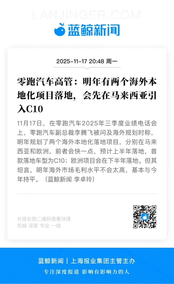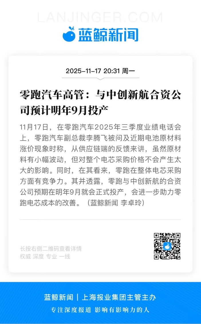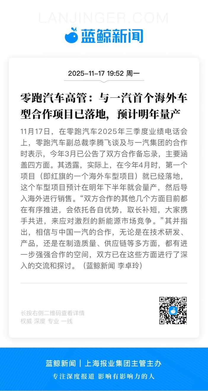 在零跑汽车Q3财报电话会上,其海外发展、渠道扩张,以及与一汽、Stellantis集团等合作成为关注焦点。被投资者问及与一汽合作时,零跑汽车副总裁李腾飞回应称,首个海外车型合作项目已落地,预计明年量产,目前双方合作的其他几个方面都在有序推进。不过,对于近期引发热议的“一汽集团将陆续收购零跑股权并最终成为其第一大股东”传闻,管理层在这场电话会上并未提及。此前,零跑汽车方面曾回应蓝鲸汽车记者称,这是不实信息。但一汽方面并未就此进行公开置评。