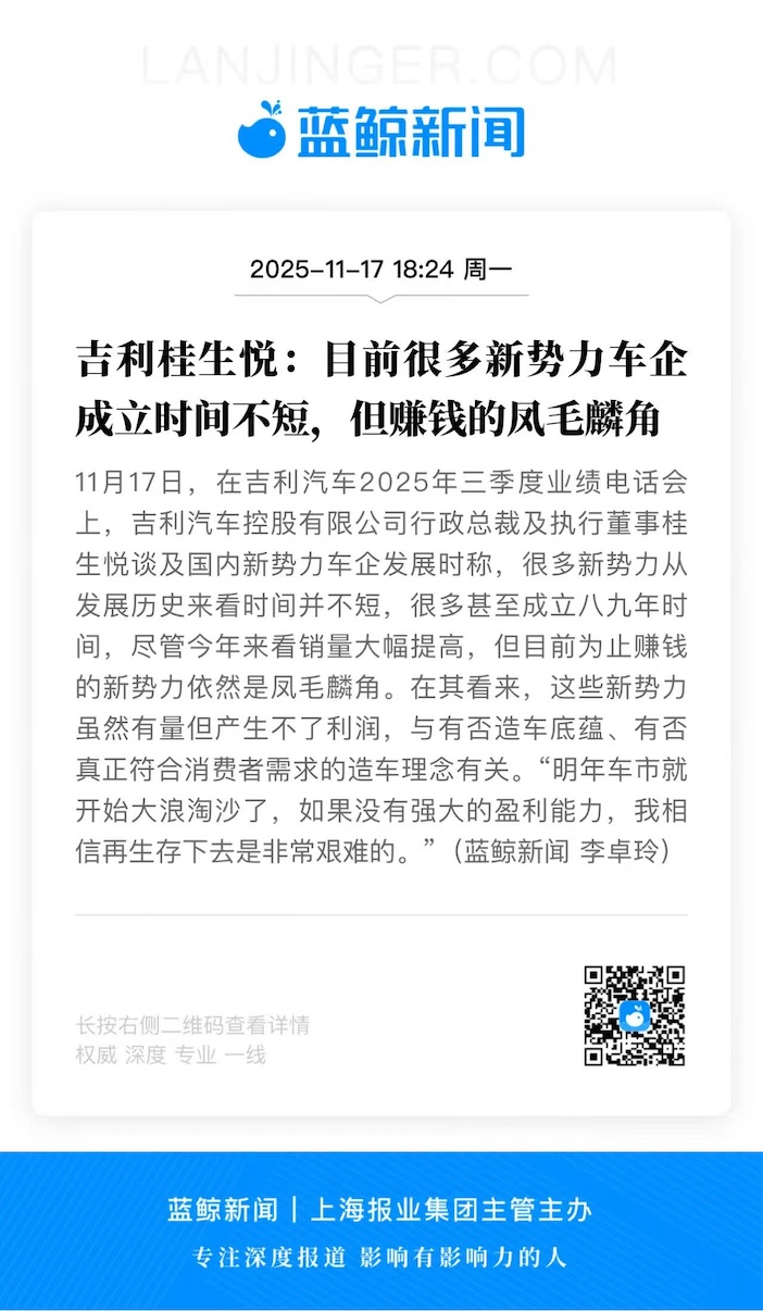 吉利管理层重点就投资者关注的吉利极氪合并事宜、新能源市场竞争、明年产品规划等进行回应。值得一提的是,吉利汽车控股有限公司行政总裁及执行董事桂生悦在谈及国内新势力车企发展时,痛批部分新势力成立时间不短,但能赚钱的凤毛麟角。其并喊话,“明年车市就开始大浪淘沙了,如果没有强大的盈利能力,相信再生存下去是非常艰难的。”