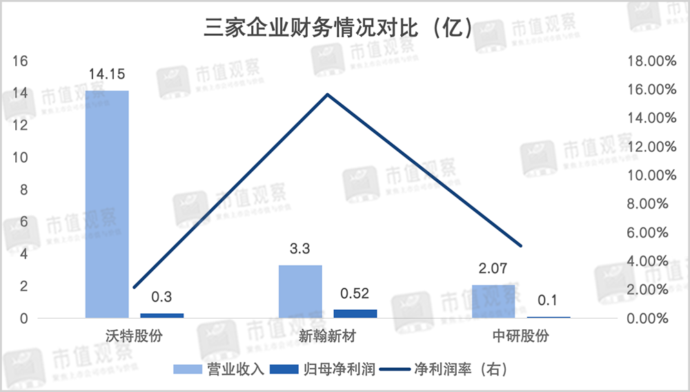 从财务对比来看,2025年前三季度沃特股份的收入规模最高但盈利能力较低,实现归母净利润0.3亿,净利润率仅2.14%,而中研股份和新瀚新材的净利润率分别为5.04%和15.62%。