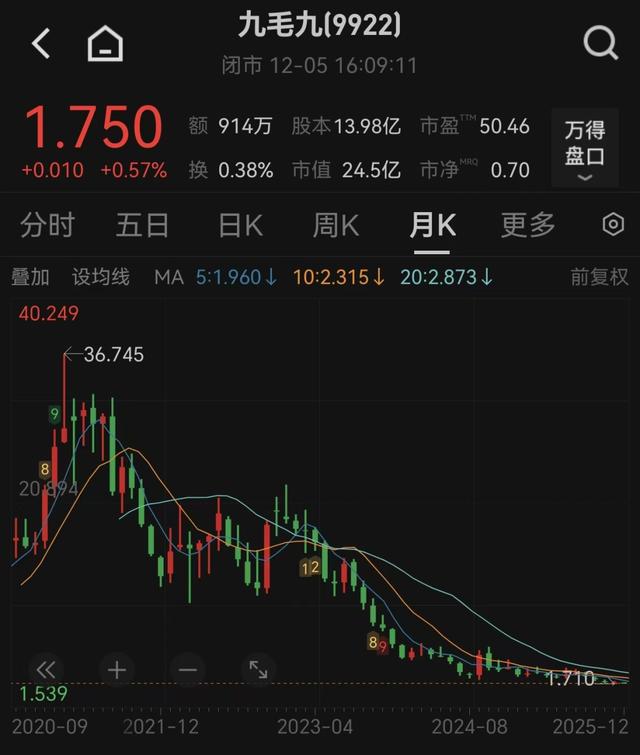 但主要原因是那时候港股行情好,个股普涨。过了这阵,九毛九就一路下跌,其最新股价只有1.75港元,市值24亿港元。
