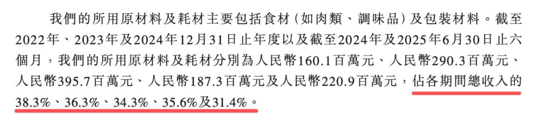 招股书显示,从2022年到2024年,遇见小面包括食材在内的的原材料及耗材占收入的比重,从38.3%下滑到了34.3%。今年上半年大幅下降到了31.4%。