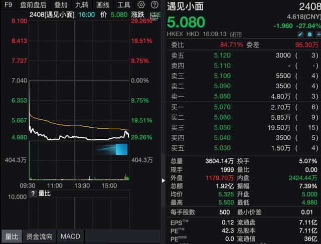 前几天超额认购400倍的遇见小面,12月5日港股上市第一天,就请股东们吃了“一碗大面”。