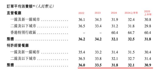 从2022年到2024年,单店订单平均消费额从36元降到了31.8元,今年上半年又降到了30.9元。