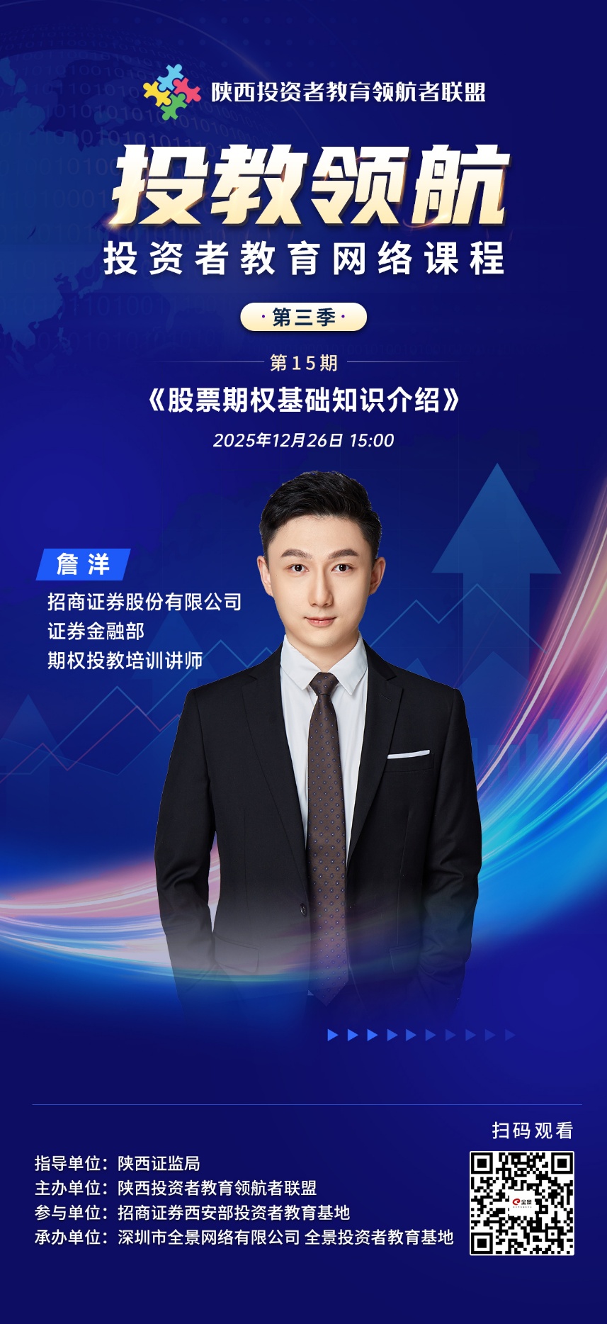 本期是2025年系列投资者教育网络课程第三季第15期,将于12月26日(星期五)15:00开播。本期课程主题是:股票期权基础知识介绍。将由招商证券股份有限公司证券金融部期权投教培训讲师 詹洋为各位投资者对以下内容进行介绍: