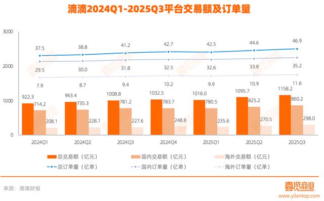 11月26日,滴滴发布了2025年第三季度财报。财报显示:滴滴第三季度核心平台总交易额(GTV)达到1158.2亿元,同比增长14.8%,实现连续5个季度GTV破千亿元;总订单量达到46.9亿单,同比增长13.8%,日均订单首次突破5000万,并连续11个季度保持了同比双位数的增长;净利润为14.6亿元,同比增长57%。