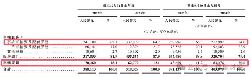 招股书显示,公司事故车拍卖业务的收入占比稳定在三分之二左右。2023年前三季度该项业务的收入还有2.59亿元,占比66.3%。2024年前三季度该项数据下降至2.18亿元,占比54%。