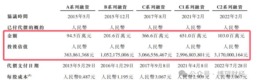 自成立以来,博车网先后获得多次融资。招股书显示,2015年公司获9450万元的A系列轮融资,投后估值为3.64亿元;2022年2月获得约1亿元的C2系列融资,投后估值达到了31.7亿元。