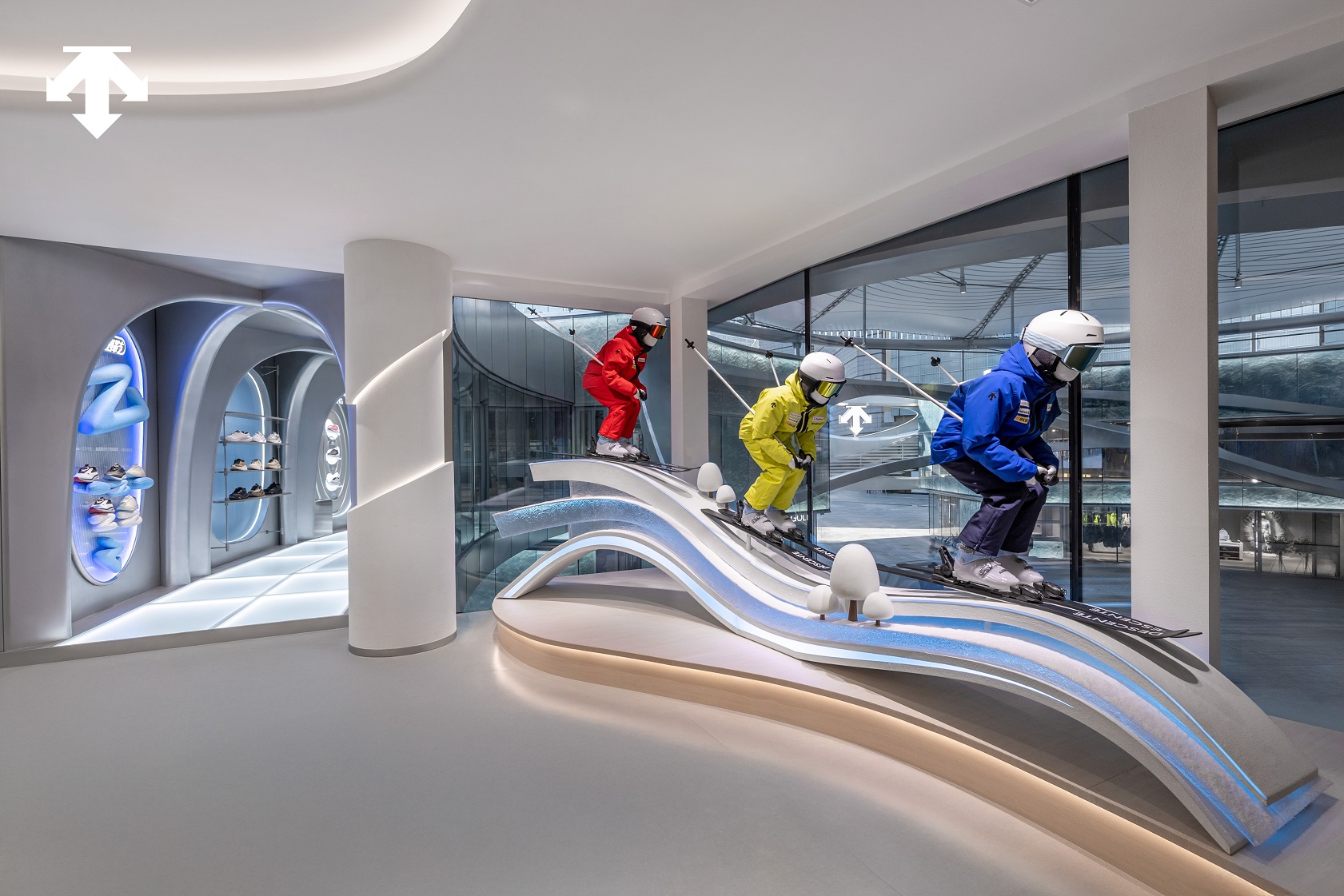 光芒循着建筑内在的莫比乌斯环轨迹缓缓蔓延,依次点亮高尔夫、BLANC、全品类专精及儿童四大主题空间,旗舰店的幕布同步徐徐开启,“未来之城”以完整姿态亮相。这座精心打造的空间巧妙融合冰雪文化构想、创新零售陈列方式与未来科技元素,从主题分区的功能规划到沉浸式场景的营造,每一处细节都凝聚着品牌对专业运动体验的创新探索。