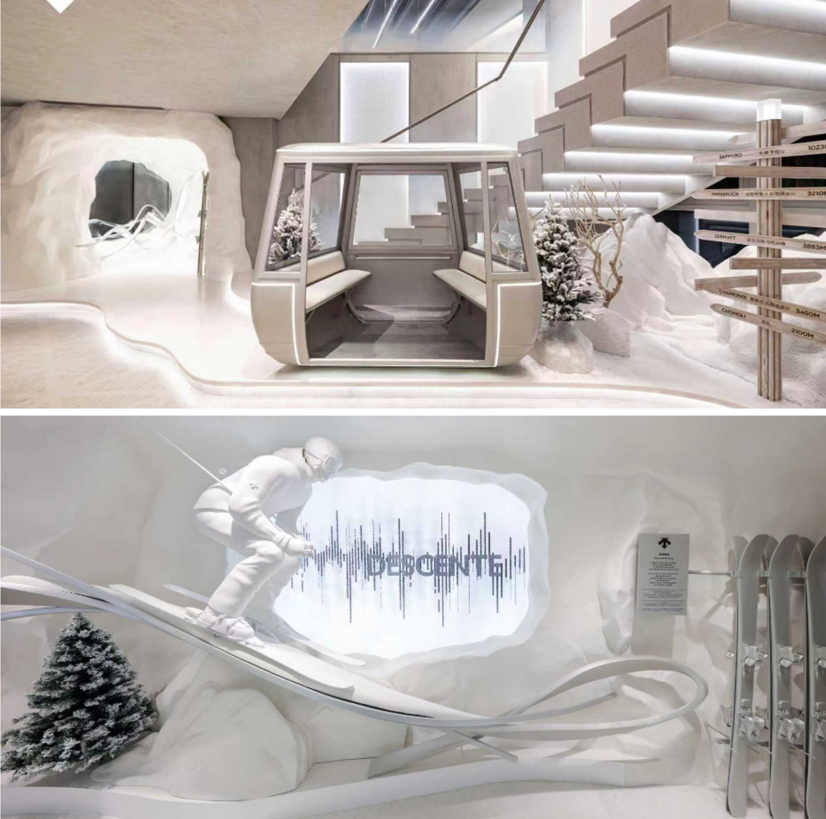 高端专业运动品牌DESCENTE迪桑特于北京华贸中心呈现“问顶未来”品牌大秀,并为其全球旗舰店“未来之城”举行启幕仪式。品牌大秀以迪桑特北京华贸全球旗舰店——“未来之城”为叙事起点,“未来之城”的设计核心源自无限向前的概念——莫比乌斯环,空间以此为母体,结合品牌基因化作无限延展的雪道,营造出周行不息的视觉体验。大秀外场以“未来雪域”为灵感,围绕滑手破雪的雪浪意象,打造出冰晶光束与金属结构交织的光影装置。