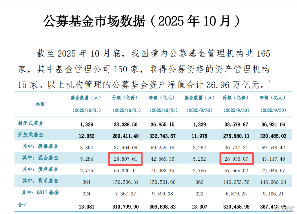 中基协数据进一步佐证上述观点,10月的混合基金继续被赎回,份额继续下降127亿份,连续4个月被净赎回。