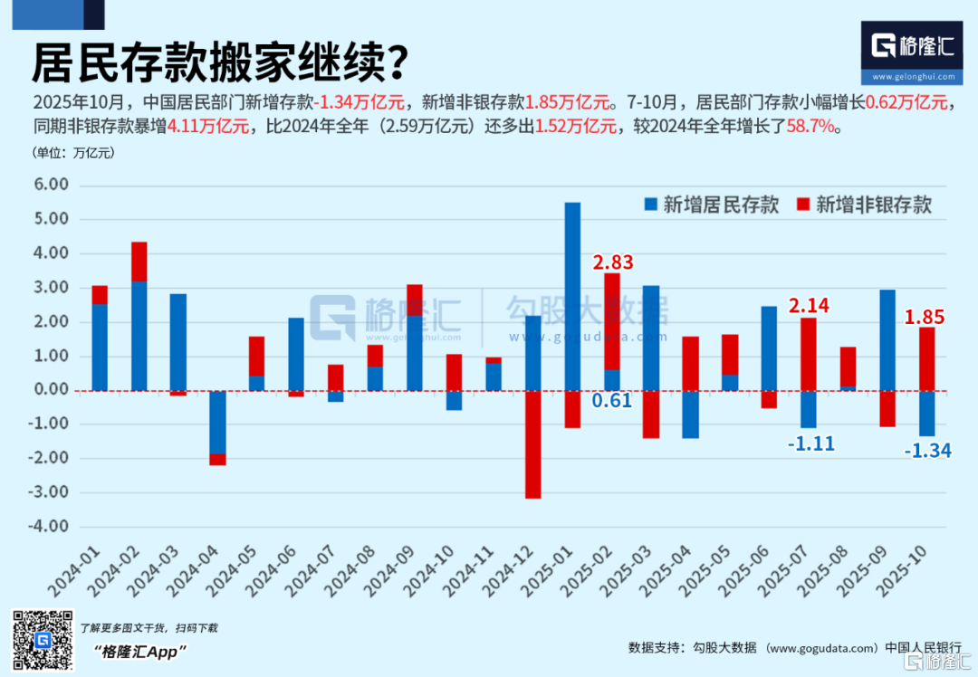 7月-10月居民部门存款小幅增长0.62万亿元,同期非银存款暴增4.11万亿元。