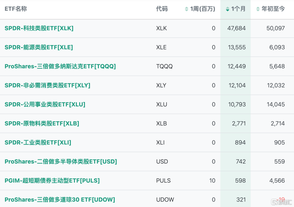 资金近一月大幅净流入科技ETF ,SPDR-科技类股ETF、三倍做多纳斯达克ETF净流入居前。