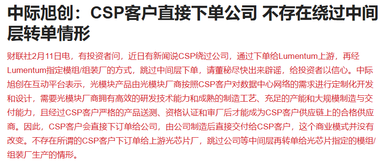 据报道,近日有新闻说CSP绕过公司,通过下单给Lumentum上游,再经Lumentum指定模组/组装厂的方式,跳过中间层下单,中际旭创早盘大跳水,午盘中际旭创出面辟谣。