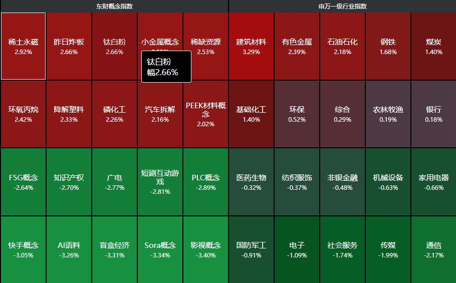 分行业来看,建筑材料、有色金属、石油石化、钢铁、煤炭等行业领涨,通信传媒、社会服务、电子等行业领跌。