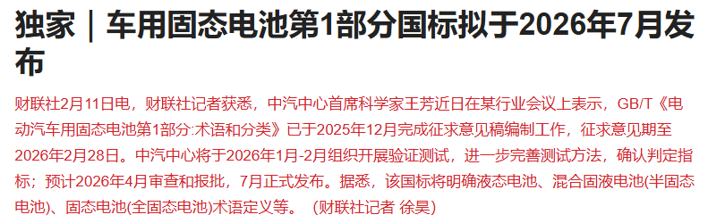据报道,中汽中心首席科学家王芳近日在某行业会议上表示,GB/T《电动汽车用固态电池第1部分:术语和分类》已于2025年12月完成征求意见稿编制工作,征求意见期至2026年2月28日。