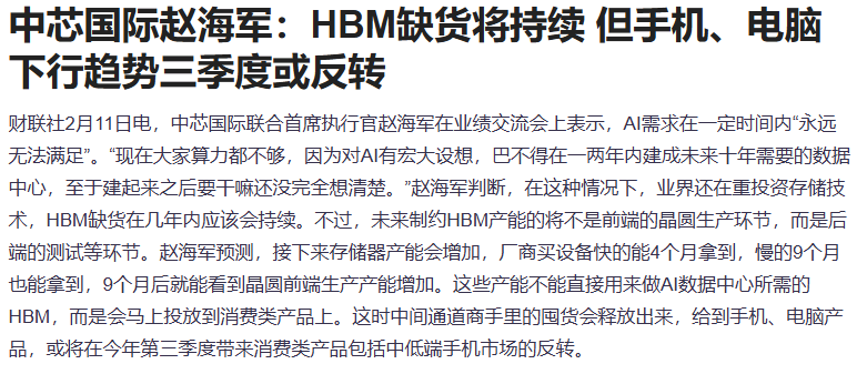 中芯国际赵海军:HBM缺货将持续,但手机、电脑下行趋势三季度或反转。