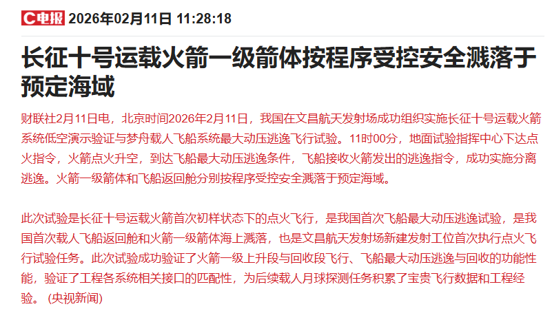长征十号运载火箭一级箭体按程序受控安全溅落于预定海域。