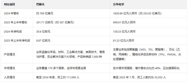 2024年,巴斯夫收入653亿欧元,约合人民币5081亿元,万华化学收入1820.69亿元,巴斯夫营收规模约为万华化学的2.8倍。今年上半年,巴斯夫销售额331.71亿欧元,约合人民币2584亿元,万华化学营收909.01亿元,巴斯夫仍具有较大优势。