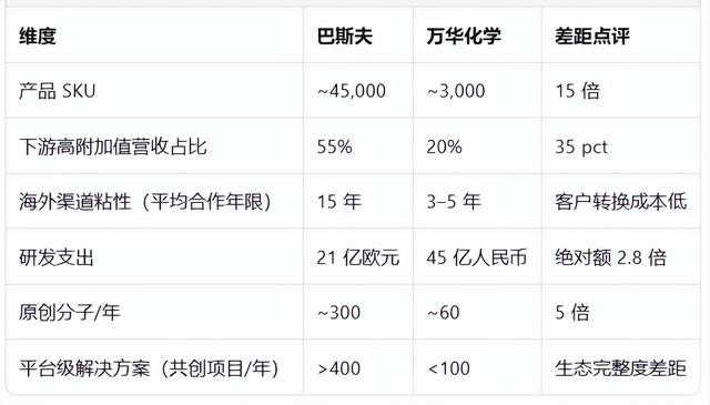 比如产品和研发方面,巴斯夫4.5万个SKU,覆盖涂料、香料、电池材料、农药、医药辅料、半导体化学品。而万华仅3千个左右,且45%营收仍集中在MDI/TDI/聚醚。