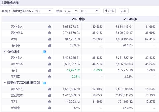 而到了今年上半年,石化产品的营收和净利润继续下滑,收入为349.34亿元,同比下降11.73%,营收占比约38%,毛利润更是跌至-1%。但好在精细化学品及新材料系列实现了崛起,上半年营收156.28亿元,同比增长20.41%,在营收的占比已经接近17%。