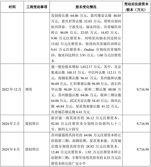 另在2024年2月,新沂强一将其持有的36.12万元注册资本、92.88万元注册资本分别转让给朗玛七十三号、朗玛七十四号;2024年8月,苏州毅强、南钢星博、复星奥来德、共青城芯微、丰聚年佳也分别出售了部分强一股份的股权。