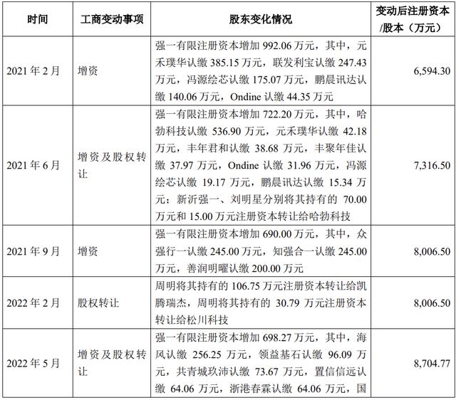 在这个过程中,亦有股东对外转让强一股份的股权。2021年6月,新沂强一、刘明星分别将其持有的70.00万元和15.00万元注册资本转让给哈勃科技;2022年2月,周明将其持有的106.75万元、30.79万元注册资本分别转让给了凯腾瑞杰、松川科技。