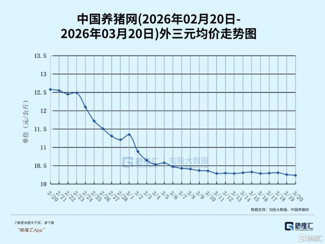 中国养猪网监测数据显示,截止3月20日,全国外三元生猪出栏均价已然跌至10.24元/公斤,即将跌破10元/公斤的心理支撑价位。