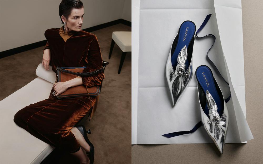 本季设计风格在品牌经典的飘逸剪裁与雕塑质感之间游走。上衣立领被赋以建筑般的硬朗线条,密实的羊绒针织衫与毯式裙装,外搭肌理感外套,呈现当代风格造型。全新款Compagnon手袋已延伸出三种不同的尺寸大小,以及包含鳄鱼压纹和亮面漆皮等多种材质在内的款式供选择。今年早先发布的全新“Lanvin Blue浪凡蓝”也悄然运用于内衬与配饰鞋垫,成为品牌的低调专属标识。