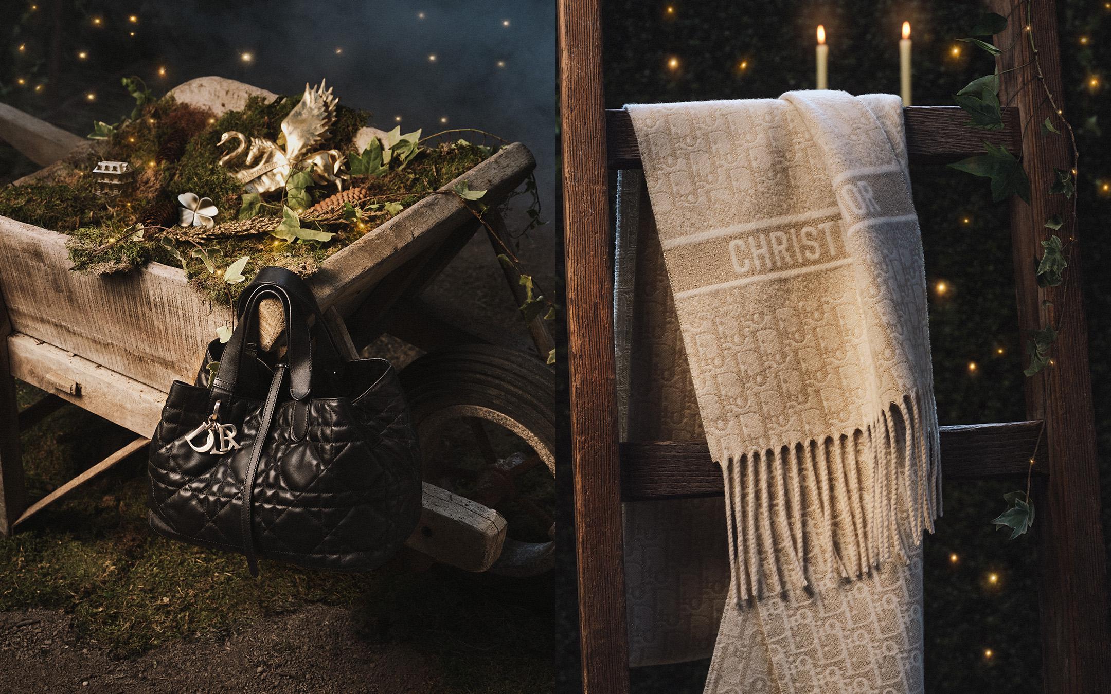 迪奥以奇幻的绮丽花园,探寻灵感缪斯。Dior Toujours手袋采用黑色牛皮革精心制作,饰以超大藤格纹缉面线,宽敞的内部隔层搭配小袋,可整齐收纳各种日常用品。设有纤细皮革系带开合,可安全收纳各种物品,另有CD Lock字母D旋钮式扣环,可调节两侧,彰显廓形。Dior印花围巾采用山羊绒混纺面料制作,饰以金色金属光泽线,凸显经典的Oblique印花。长款设计搭配流苏饰边,可围在颈部或披在肩部。