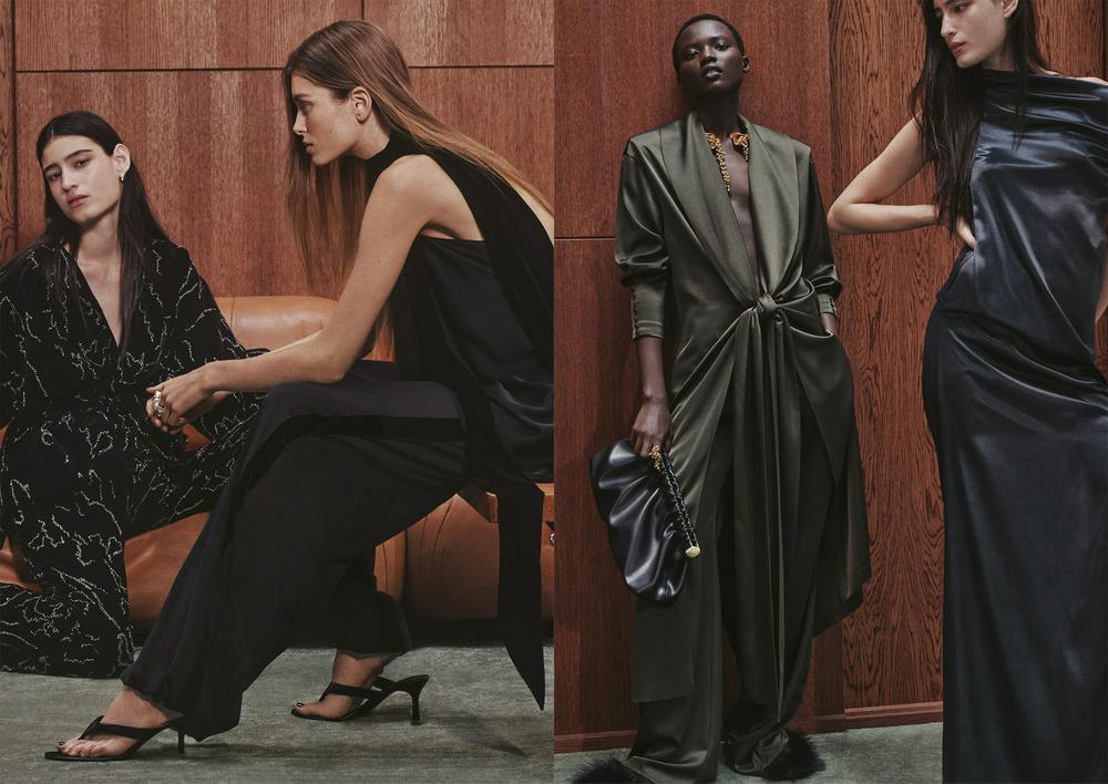 本季女装系列色调以克制而深邃的中性色为主,黑、白、灰、酒红与苔绿相互交织,于不同面料间折射出细微层次,面料通过亮片织物、缎面丝绒与柔软针织等材质,搭配自由的剪裁与流动的廓形营造戏剧张力。缎面露背上衣搭配垂坠长裤,呈现出利落而优雅的穿着效果。褶裥礼服通过结构设计增强整体动感,挺括的双排扣西装则在造型中注入干练力量感。整体系列围绕派对着装场景展开,强调造型张力与穿着表现力。