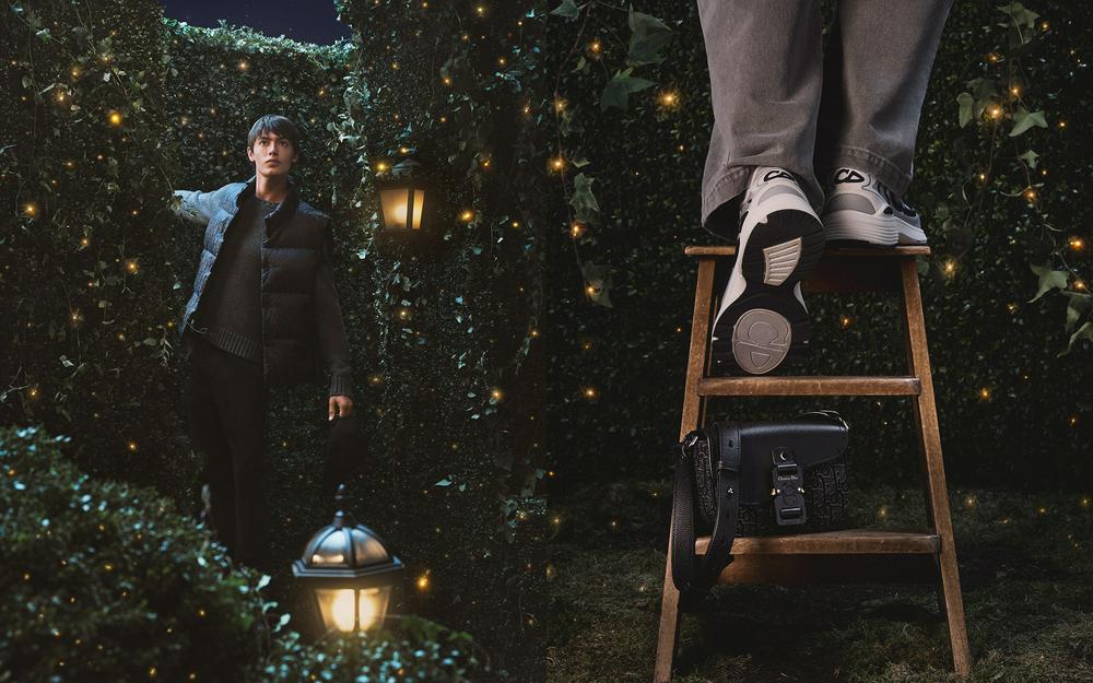男装部分延续Dior一贯的标识语言与功能取向。羽绒背心以黑色棉质混纺面料打造,Oblique印花贯穿其中,背面点缀Dior橡胶补丁,立领与贴边口袋强化实穿属性。Dior Icons针织衫来自2026春季男装系列,选用灰色山羊绒平纹针织面料,肩部融入灯芯绒拼接。小号马鞍翻盖信使包以黑色Oblique印花材质结合粒面牛皮革马鞍翻盖,并饰以铝扣细节,兼顾容量与辨识度。B30 Countdown科技运动鞋则以现代跑步运动为灵感,采用N3O尼龙等多层半透明科技面料,饰以海军蓝色塑橡胶镶片与CD30标志。