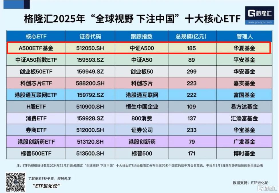 笔者注意到,2025年格隆汇“全球视野 下注中国”十大核心ETF已经发布,其中,跟踪A500指数的A500ETF基金(512050)入选。