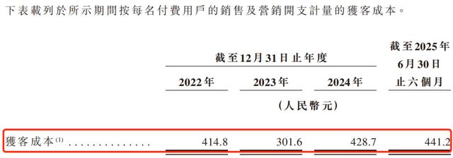 与此同时,获客成本却在持续攀升。按每名付费用户的营销开支计算,获客成本从2023年的301.6元大幅上升至2024年的428.7元,2025年上半年进一步增至441.2元,较2023年上涨超过百元。