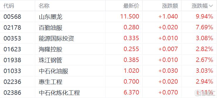 油气设备股集体走强,港股市场中,山东墨龙涨近10%,百勤油服涨7.69%,能源国际投资涨超3%,海隆控股、中石化油服跟涨。