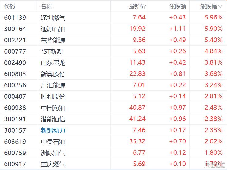 A股市场中,通源石油、东华能源涨超5%,山东墨龙、广汇能源涨超3%,中国海油、潜能恒信、中曼石油等跟涨。