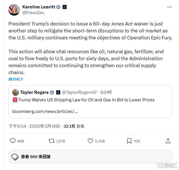 白宫新闻秘书卡罗琳·莱维特在声明中指出,暂时豁免《琼斯法案》“将允许石油、天然气、化肥和煤炭等重要资源在六十天内自由流向美国港口”。