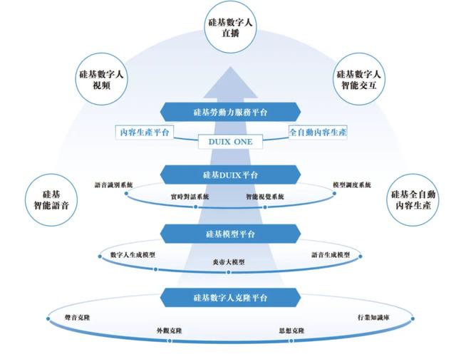 在三次技术跃迁过程中,硅基智能形成了硅基数字人克隆凭条、硅基模型平台、硅基DUIX平台和硅基劳动力服务平台,商业模式从最初的“卖工具”逐步转向“卖结果”,提供完整的API调用平台,业务涉及DUIX智能交互、虚拟直播、视频生产以及智能客服等。